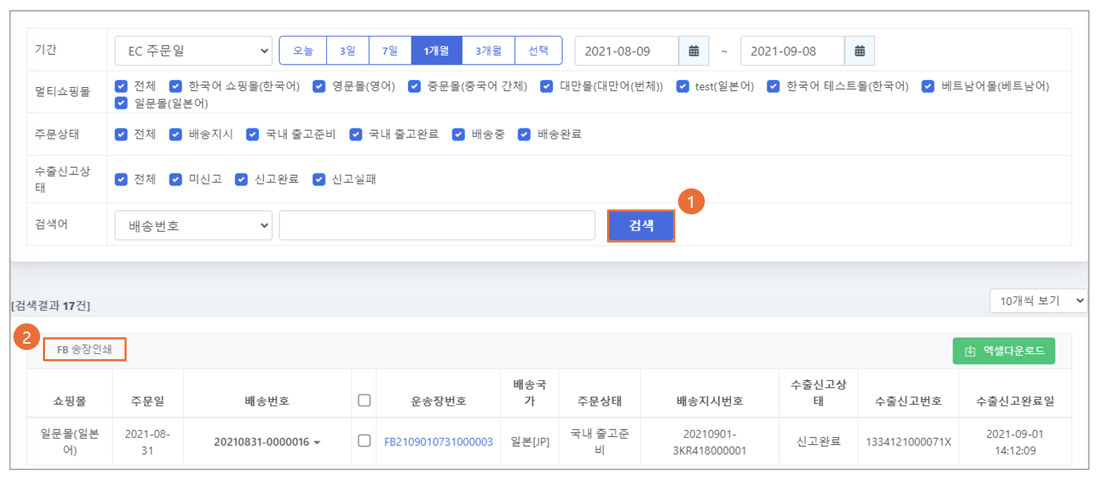 송장 인쇄 | 주문 선택 → [FB 송장인쇄] 클릭 |