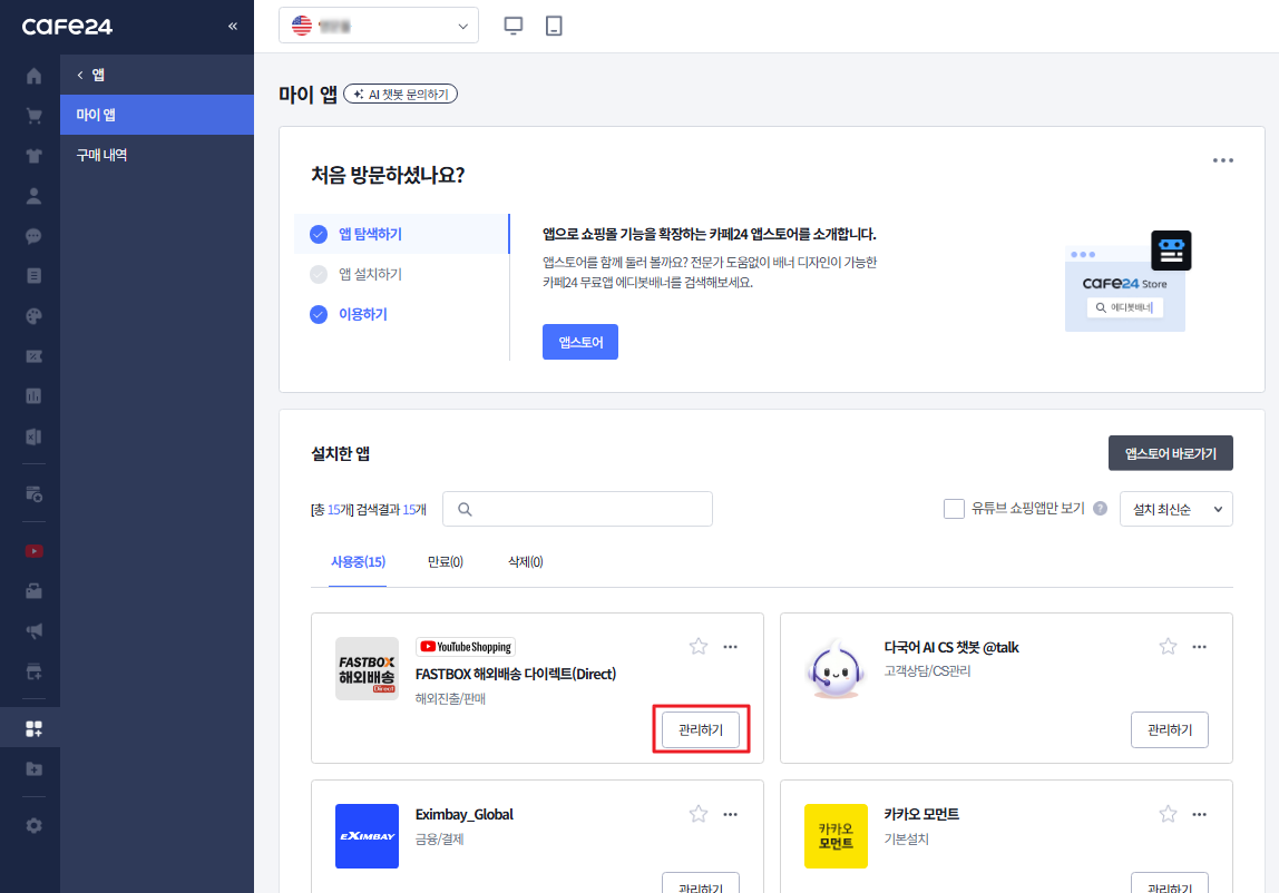 1. 쇼핑몰 관리자 [관리자] > > 마이앱 으로 이동하여 FASTBOX 해외배송 다이렉트(Direct) 앱의 ‘관리하기’를 클릭하여 서비스를 신청해주세요.