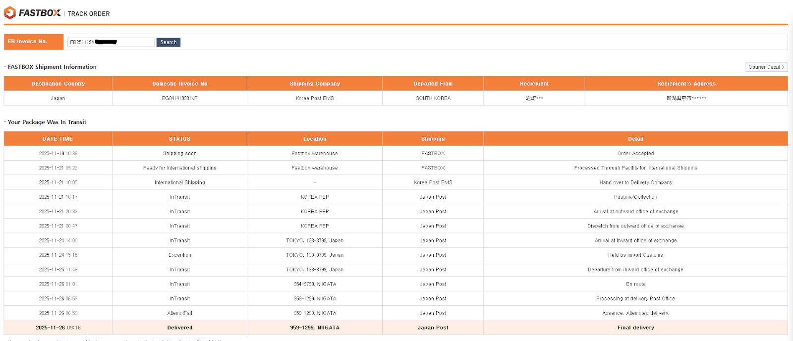 쇼핑몰 주문 상태와 실제 배송 상태는 업데이트 시점이 다를 수 있어요. 정확한 배송 상태는 [배송 추적] 버튼을 클릭해서 FASTBOX 트래킹 페이지에서 확인해 주세요.