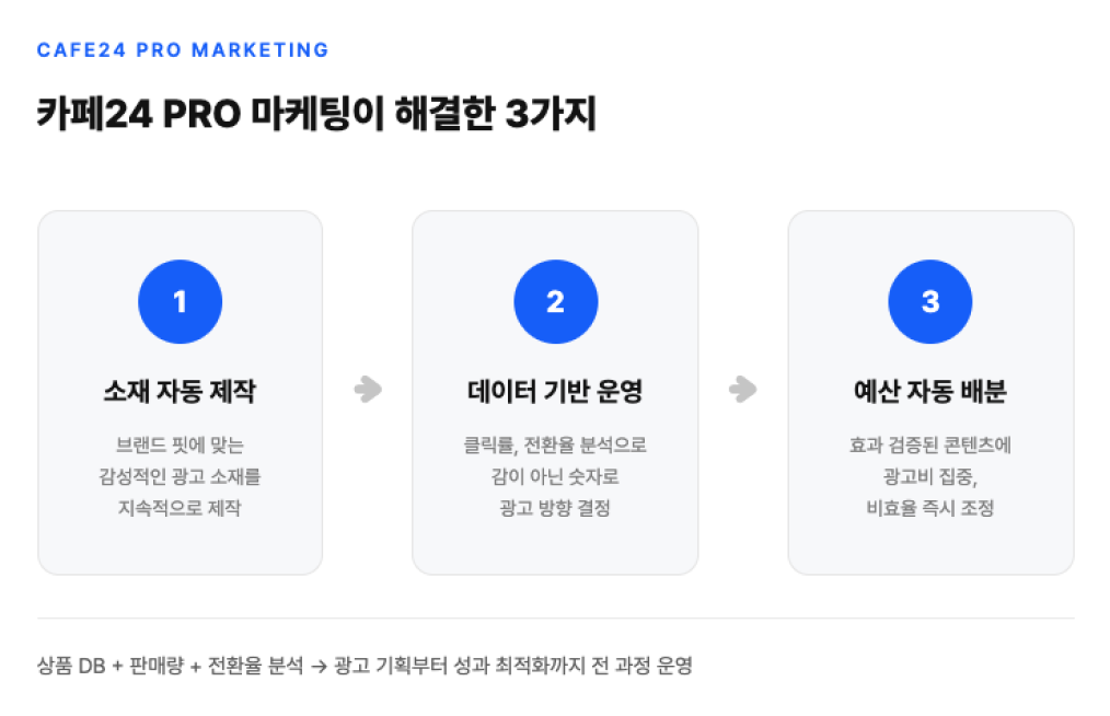 PRO 마케팅은 쇼핑몰의 핵심 데이터(상품 DB, 판매량, 전환율, 재고 등)를 분석해서 광고 기획부터 소재 제작, 집행, 성과 최적화까지 전 과정을 전문 마케터와 AI가 함께 운영하는 일임형 광고 서비스입니다.