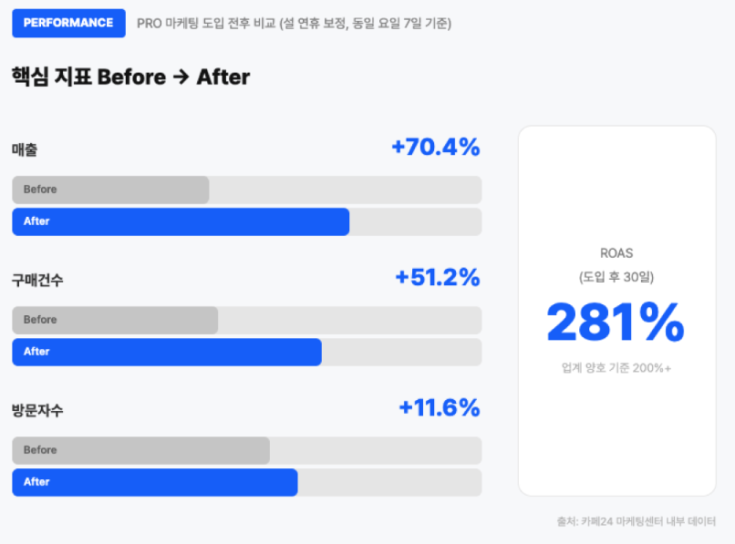 광고 전환 성과도 주목할 만해요. PRO 마케팅 도입 후 30일 동안 ROAS 281%를 기록했습니다.