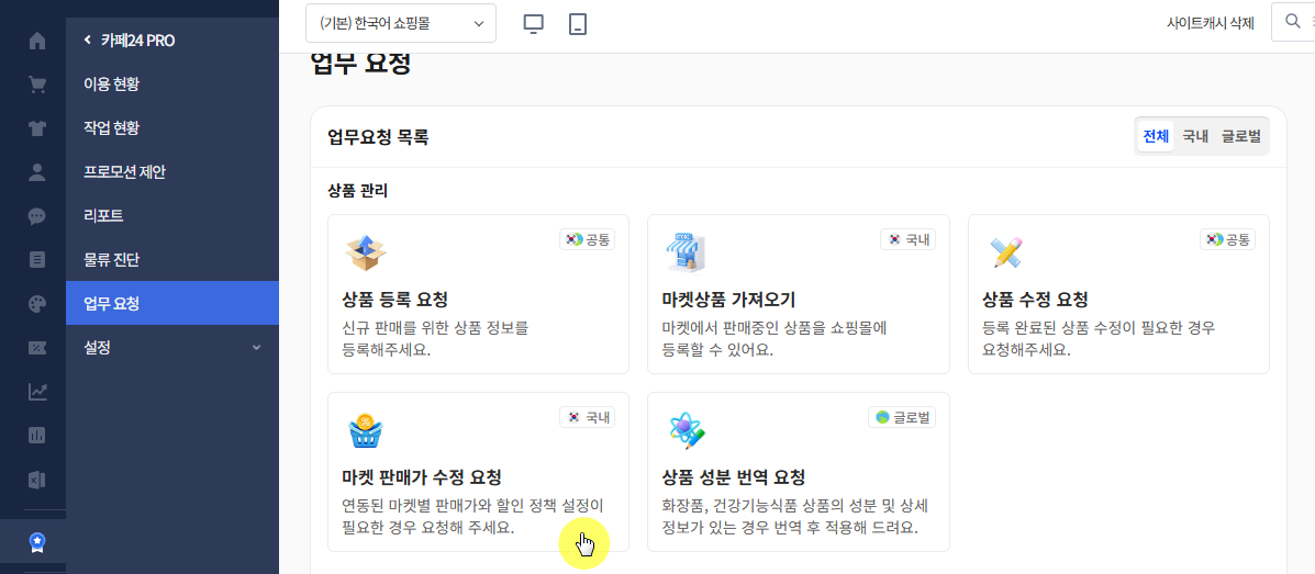 카페24 쇼핑몰 어드민 > 카페24 PRO > 업무요청 > 마켓 판매가 수정 요청