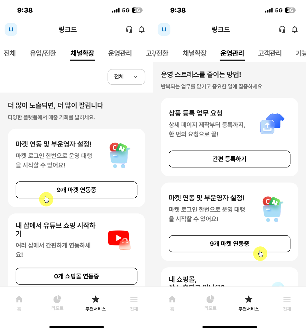 2. 추천서비스 > 채널확장 > 마켓 연동 및 부운영자 설정 또는