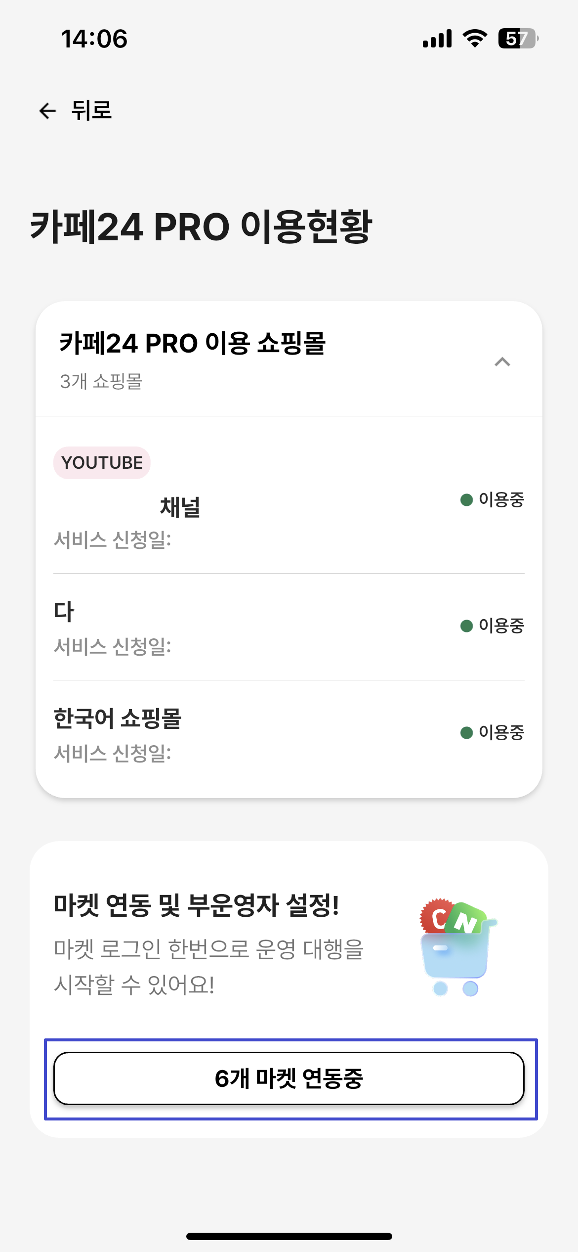 마켓 서비스는 카페24 PRO 앱을 통해 신청하실 수 있습니다.