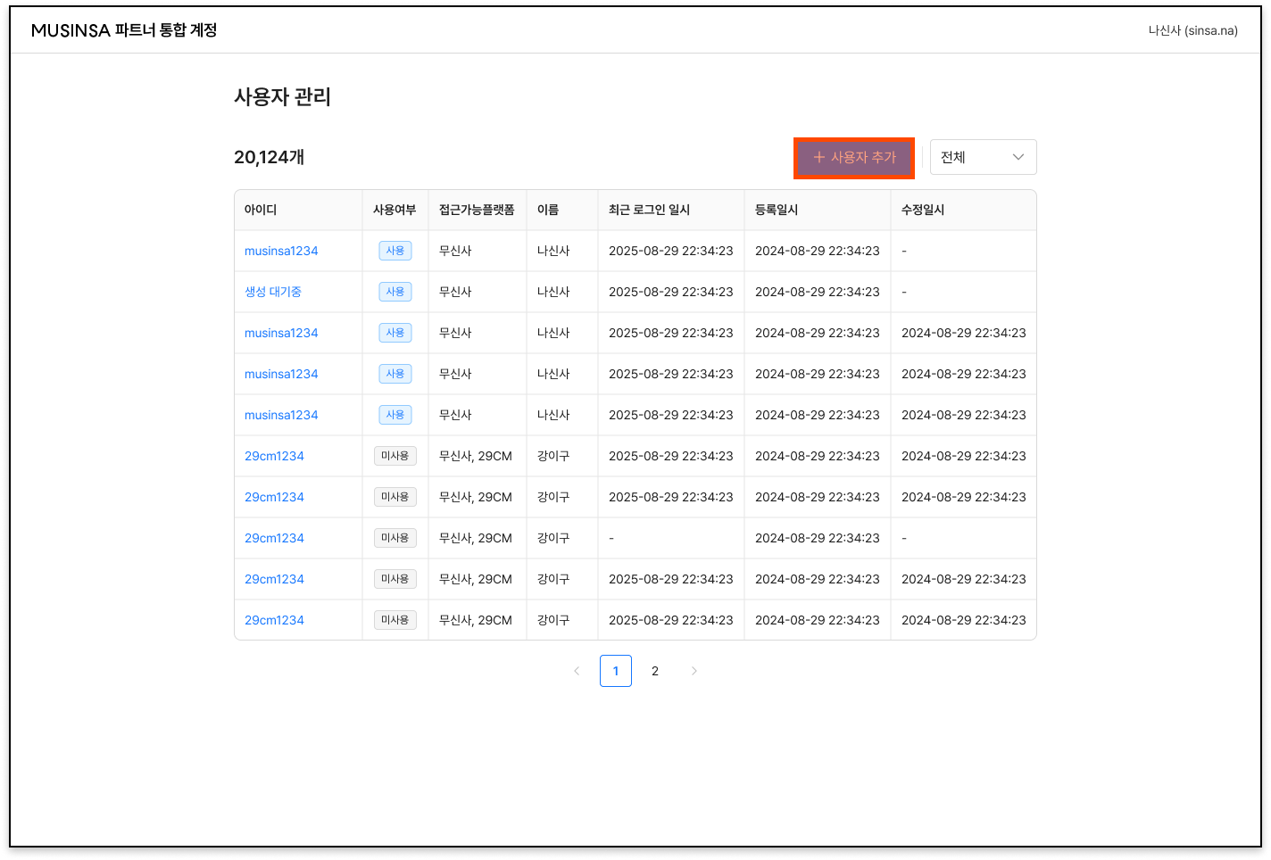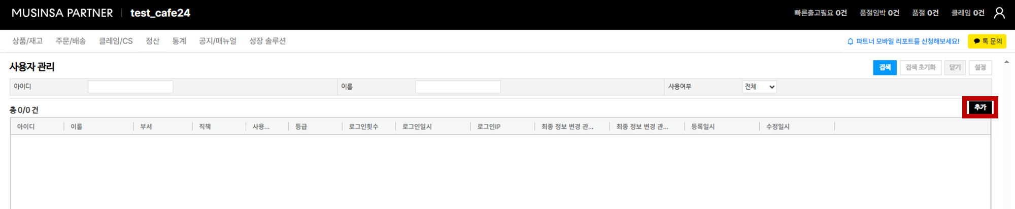 [사용자 관리] 페이지에서 ’추가’ 버튼을 클릭합니다.