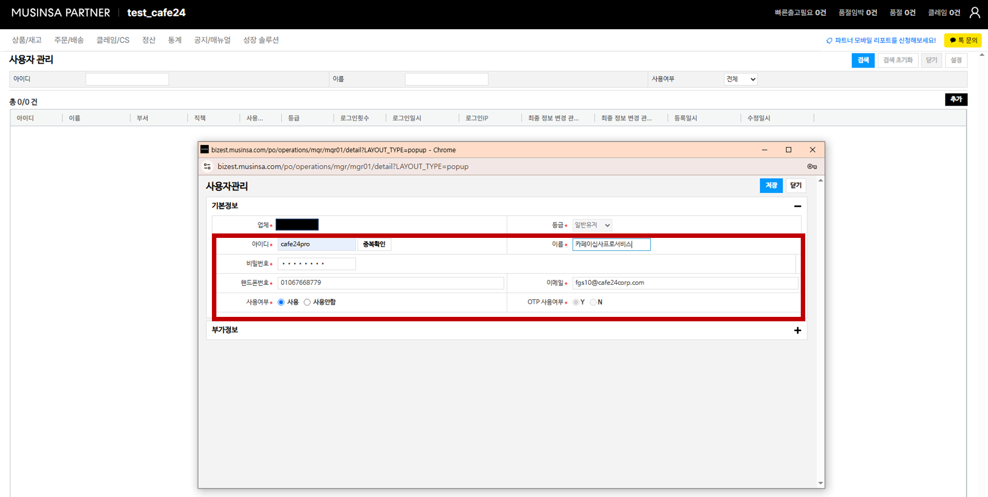 [사용자 관리] 팝업창이 열리면 추가할 사용자의 필수 정보를 입력합니다.