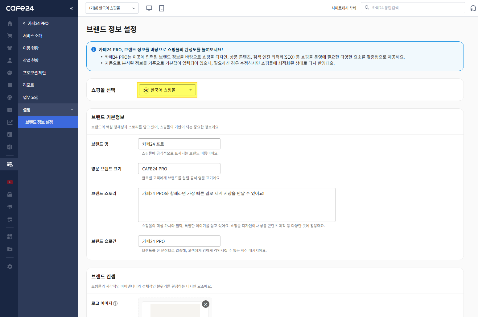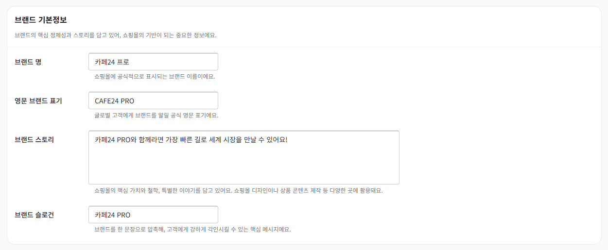 경로 : 카페24 관리자 페이지 > 카페24 PRO > 설정 > 브랜드 정보 설정