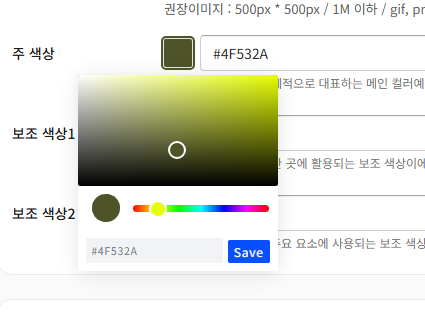 주 색상/보조색상은 브랜드 컬러 코드를 직접 입력하여 설정이 가능하며, 컬러칩을 클릭하시면, 원하는 컬러를 스포이드 도구를 이용하여 선택하실 수도 있습니다.
