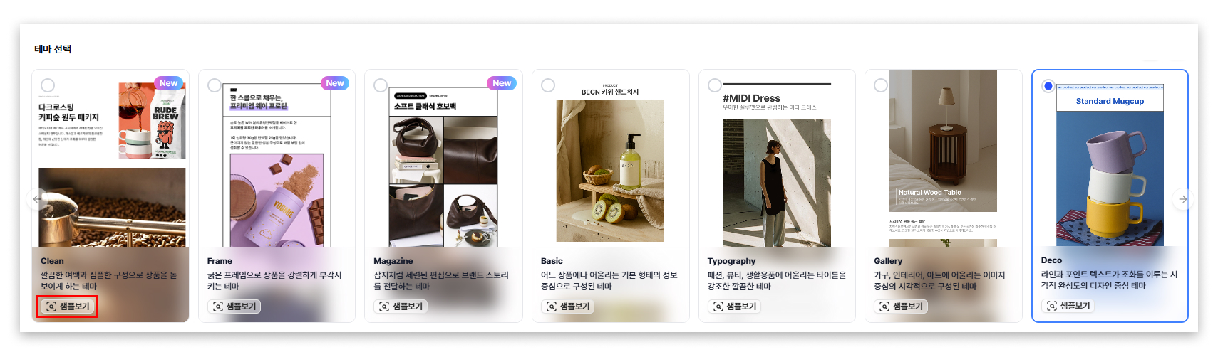 > '상품 등록 요청' 클릭 후 하단 테마별 샘플보기를 통해 상세 확인 가능해요.