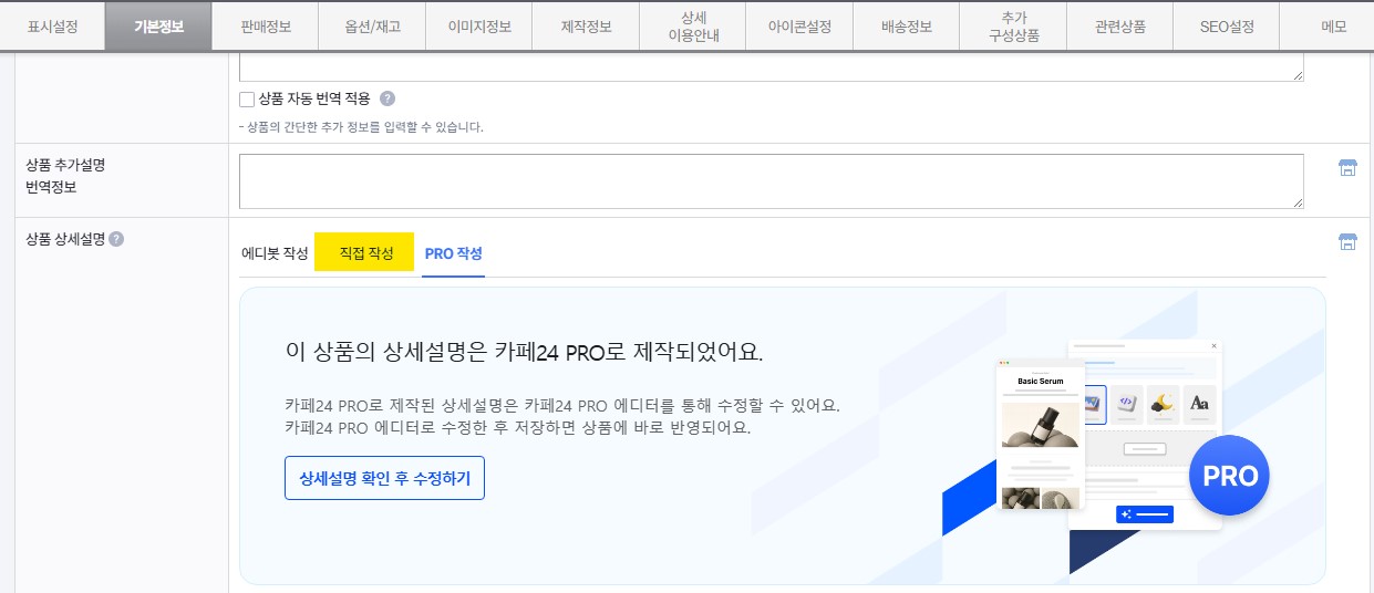 상품 상세페이지 수정 프로세스 안내 : 카페24 어드민 로그인 → 상품 → 상품목록 → 수정할 상품 선택 후 상품상세설명 "직접 작성"으로 변환 후 수정