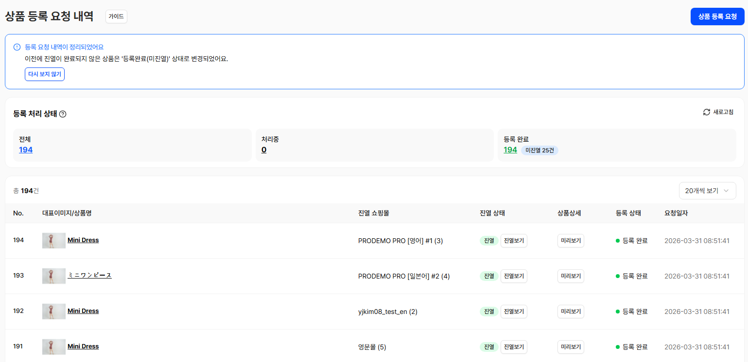[쇼핑몰 관리자] > 카페24 PRO > 업무 요청 > 상품 등록 요청 내역