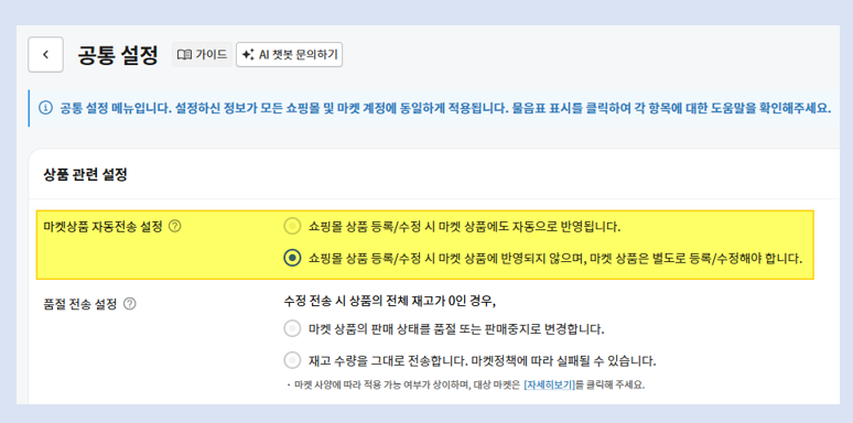 ①카페24 마켓플러스 > 기본 > 설정 > 공통설정 - 상품 관련 설정 : 마켓상품 자동전송 설정 항목