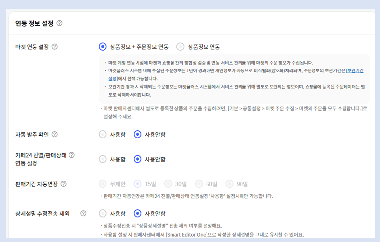 오픈마켓 상품을 카페24 쇼핑몰에 등록 후 연동된 마켓으로 상품정보 연동을 원하지 않는 경우, 다음 설정을 반드시 확인해 주세요. (설정사항 자세히 보기)