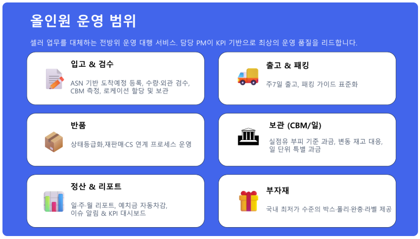 카페24 PRO 전용 풀필먼트 서비스는 온보딩부터 입고·재고·출고·반품 관리까지 전 과정을 통합 제공합니다.