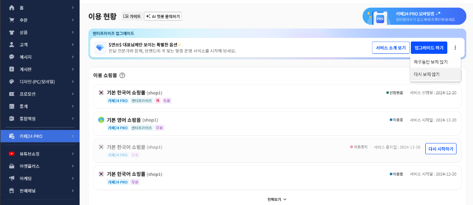 PRO 서비스 신청 후, 관리자 페이지에 ‘업그레이드 하기’ 버튼이 노출되는지 확인해주세요.