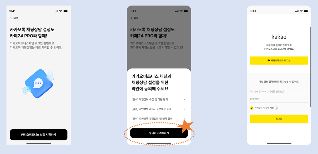 앱을 통해 카카오비즈니스 설정이 안되는 경우, 아래의 가이드를 참조하여 직접 설정도 가능합니다.