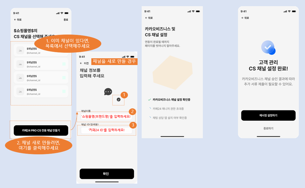 카카오 비지니스채널 설정 직접하기 가이드 STEP1~4 링크 각각 순서대로 진행해주세요.