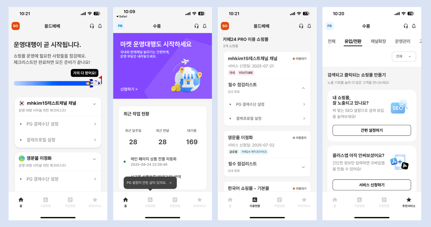 카페24 PRO 앱을 통해 서비스 시작에 필요한 일과 중요한 정보를 한눈에 확인할 수 있습니다.