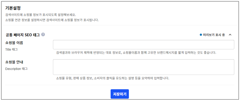 참고: SEO 설정은 검색엔진이 쇼핑몰 콘텐츠를 잘 이해하도록 돕는 작업입니다. 검색 결과 상위 노출을 보장하지는 않으며, 검색엔진 알고리즘과 다양한 요소에 따라 결과가 달라질 수 있습니다.