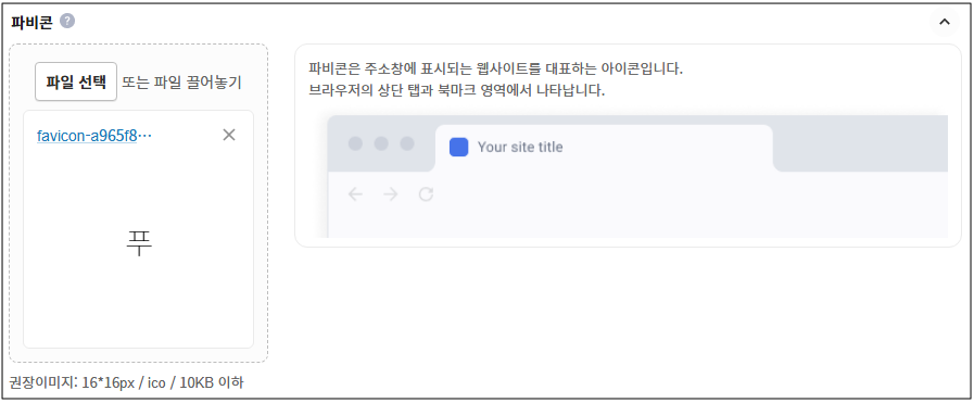 확인 경로: 쇼핑몰 설정 → 기본 설정 → 검색엔진 최적화(SEO) → 파비콘 설정