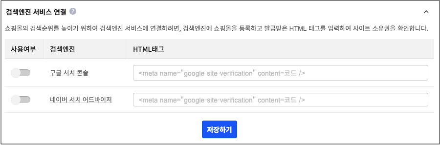확인 경로: 쇼핑몰 설정 → 기본 설정 → 검색엔진 최적화(SEO) →검색엔진 서비스 연결