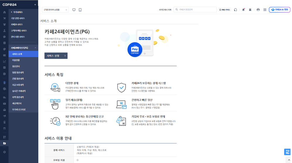 관리자 → 부가서비스 → 카페24페이먼츠(PG) → '서비스 소개'로 이동하세요.