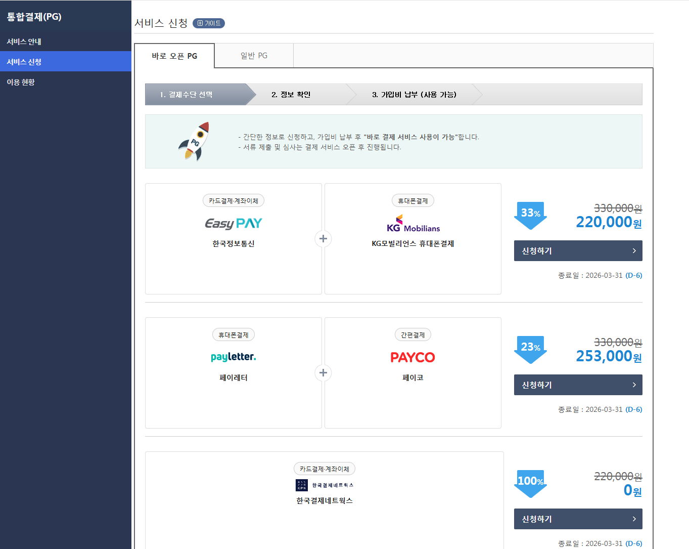 신청 방식 | 가입비 없이 자동 신청 | 결제 서비스 선택 후 가입비 결제 필요 |
