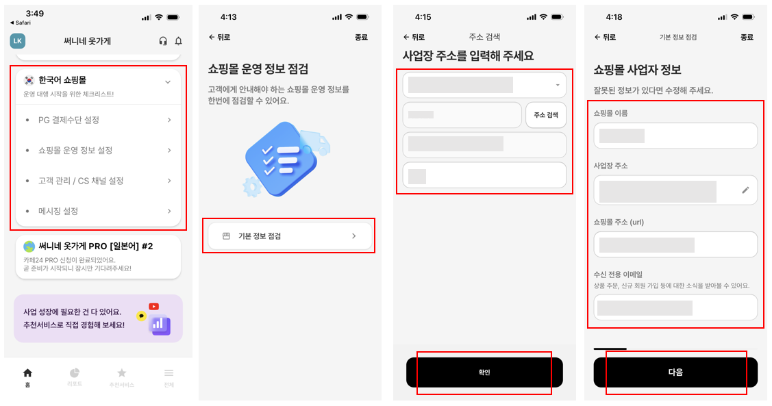 '확인' 버튼을 클릭 후 다음 페이지에서 쇼핑몰 사업자 정보를 입력해 주세요.
