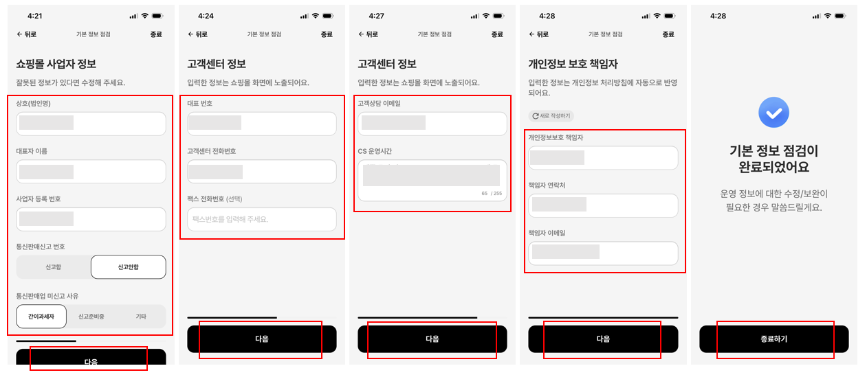④ 고객센터 정보를 입력한 후, '다음' 버튼을 클릭해 주세요.