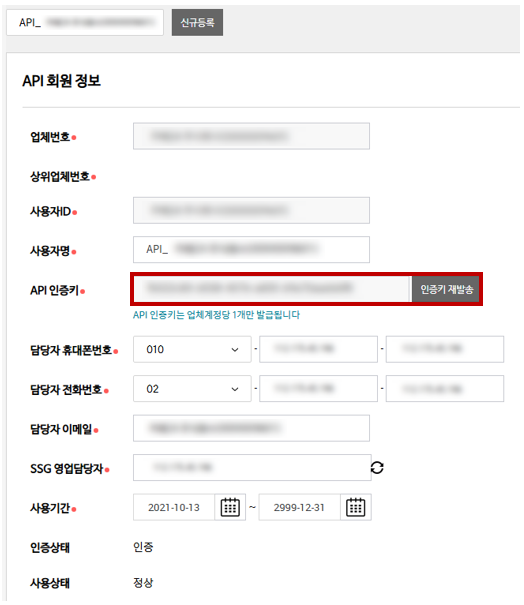 [SSG 파트너 오피스 접속 > API 관리 > API 계정 정보] 메뉴로 이동합니다.