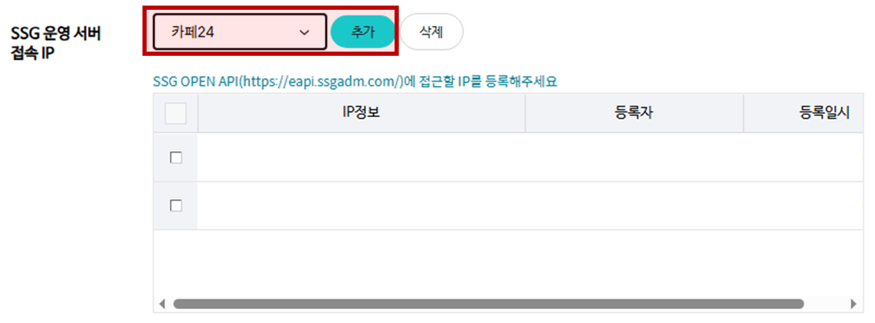 2-2) 페이지 하단 'SSG 운영 서버 접속 IP' 리스트에 카페24가 지정됐는지 확인