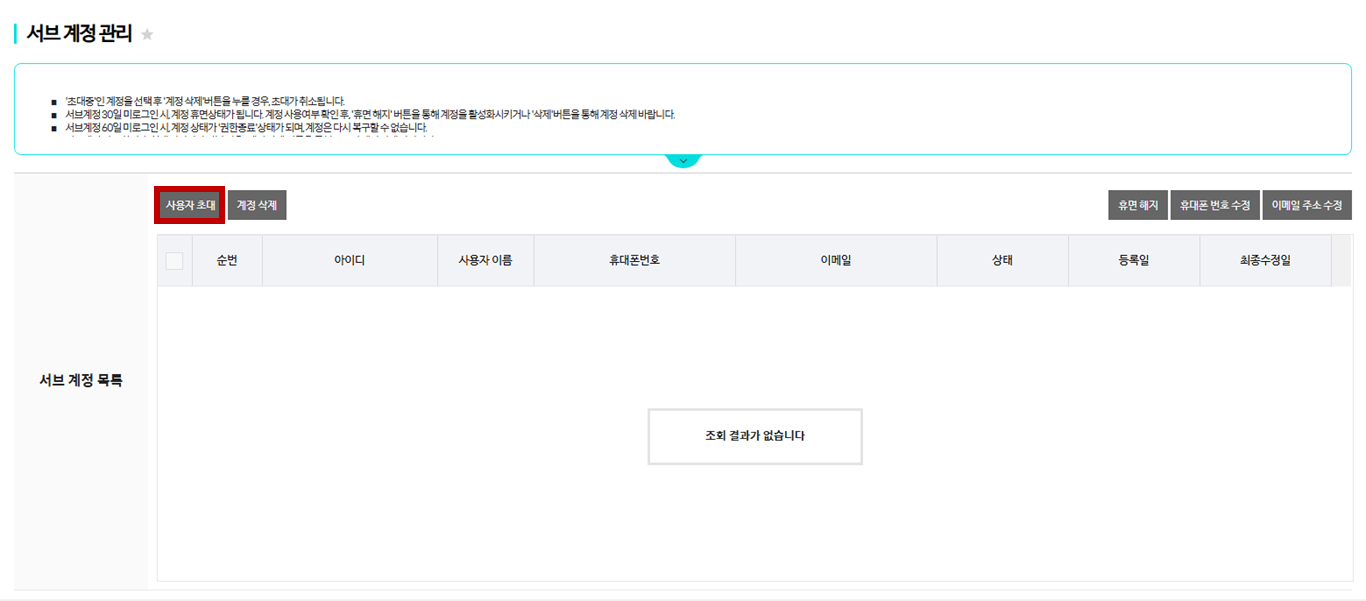[서브 계정 관리] 페이지에서 ’사용자 초대’ 버튼을 클릭합니다.
