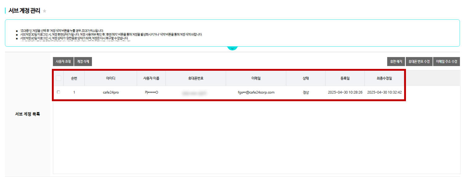 2) 연락처 정보(이메일 주소): fgs07@cafe24corp.com계정이 생성되면 목록 박스에 초대할 사용자 정보가 추가되며, 초대 받은 사용자가 승인 및 2차 인증을 마치면 계정 상태가 ‘정상’으로 표시됩니다. (초대 링크 유효기간 5일)