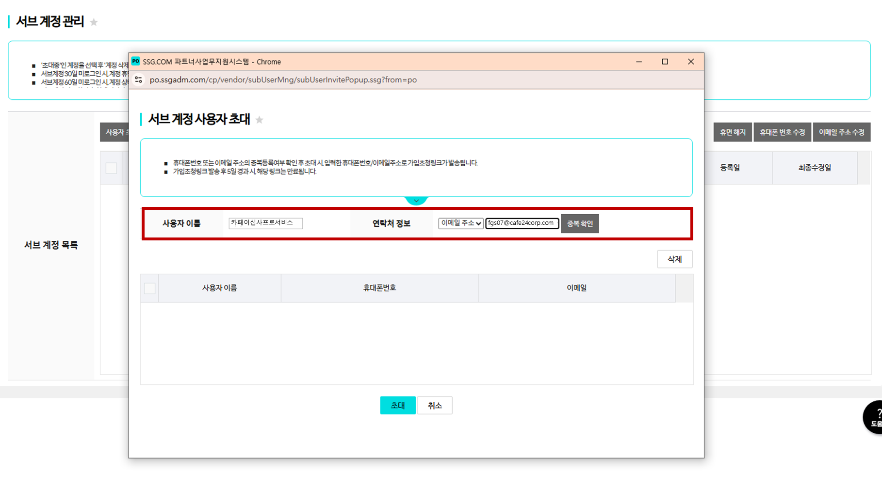 [서브 계정 사용자 초대] 팝업창에서 초대할 사용자의 정보를 입력합니다.