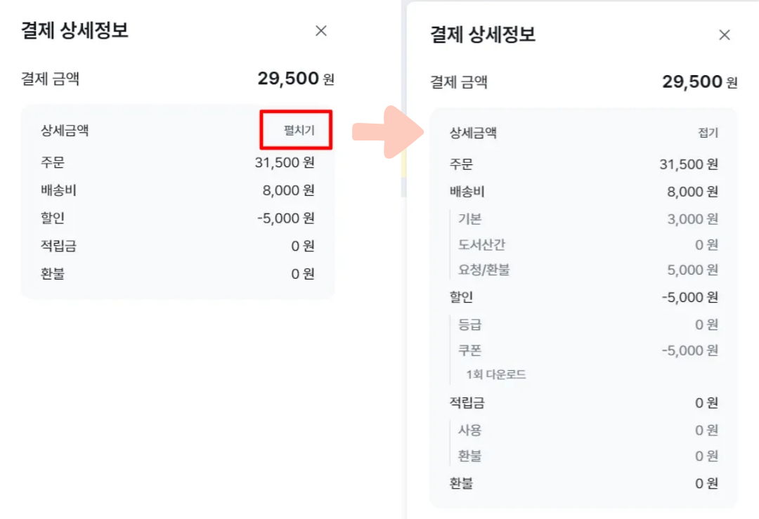 혹은 주문 목록의 ‘최총 실결제금액’ 부분을 클릭하여 위와 동일한 내용을 보실 수 있습니다. 하단 ‘자세히’ 버튼 클릭 시에는 결제 상세 정보로 이동 되는 점 참고해 주세요.