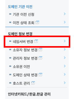 왼쪽 아래의 도메인 정보 변경 항목에서 네임서버 변경을 클릭합니다.