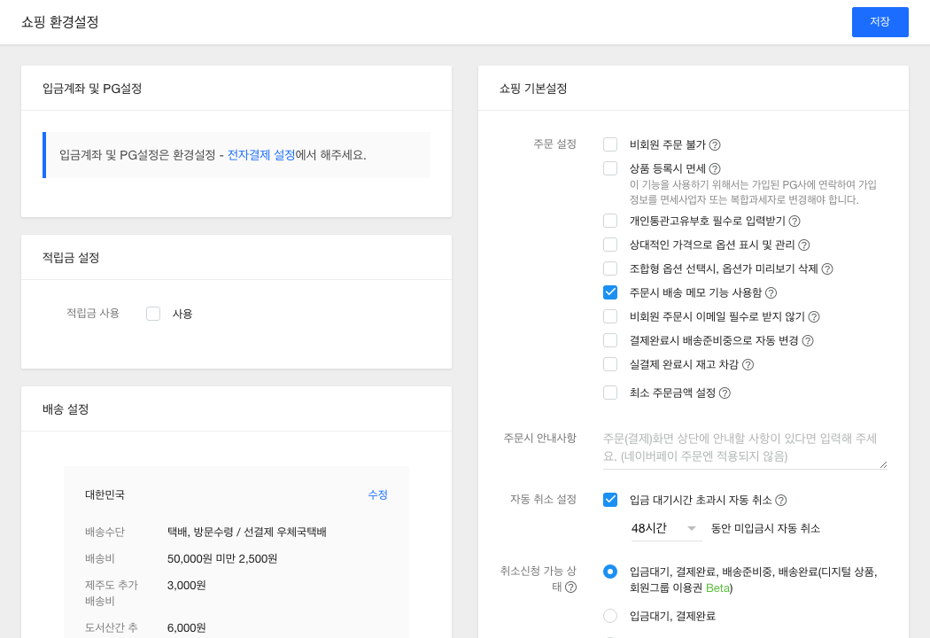 가장 처음으로 해야 할 일은 쇼핑 환경을 설정하는 일입니다. 적립금 설정, 배송방법, 비회원 구매 가능여부, 개인통관고유부호 필수 입력 받기 등 쇼핑몰의 기본 쇼핑 환경을 설정합니다.