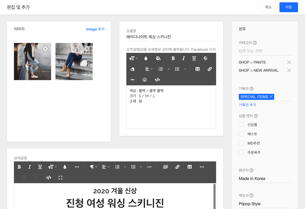 판매할 상품을 등록합니다. 상품 썸네일 이미지, 상품명, 상세 설명, 가격, 브랜드/원산지 정보 등 상품의 상세 정보를 추가하고, 해당 상품이 속할 카테고리를 설정하는 방법을 알아봅니다.