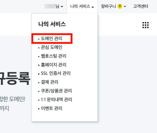 오른쪽 상단 나의 서비스 클릭한 다음 도메인 관리를 클릭합니다.