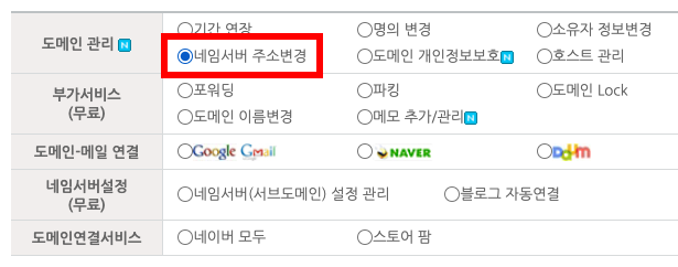 도메인 관리 항목에서 네임서버 주소변경을 선택합니다.