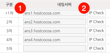 캠페이너스 네임서버를 입력합니다. 위 1단계에서 확인한 할당된 네임서버를 1차 네임서버에 입력하고, 오른쪽 IP Check 버튼을 클릭합니다. 같은 방법으로 4차까지 입력 및 확인을 반복합니다.