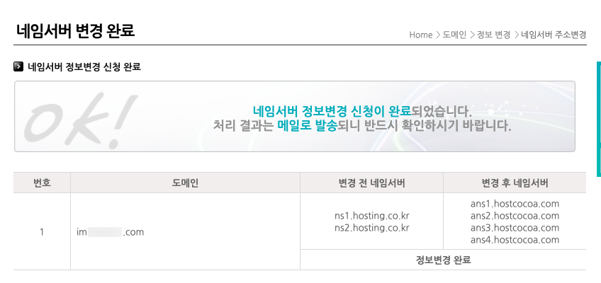 네임서버 변경 작업이 완료되었습니다. 이제 최대 48시간 이내 해당 도메인 주소로 사이트 접속이 가능해집니다.