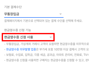 현금영수증 신청 기능 항목에서 현금영수증 신청 사용을 선택합니다.