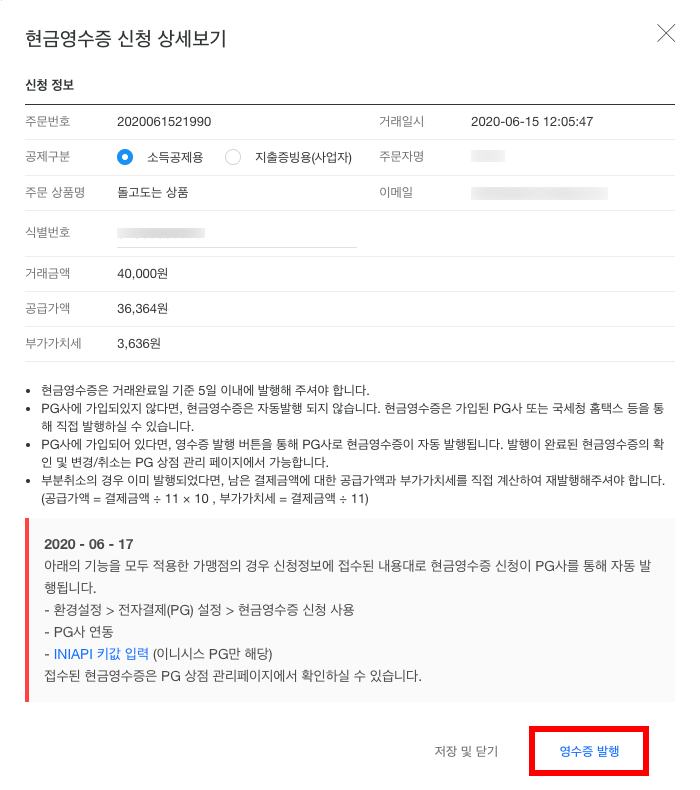 이제 가입하신 PG사를 통해 현금영수증이 발급됩니다.