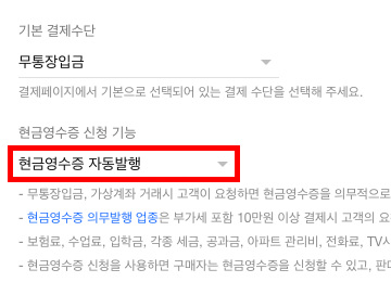 현금영수증 신청 기능항목에서 현금영수증 자동발행을 선택합니다.