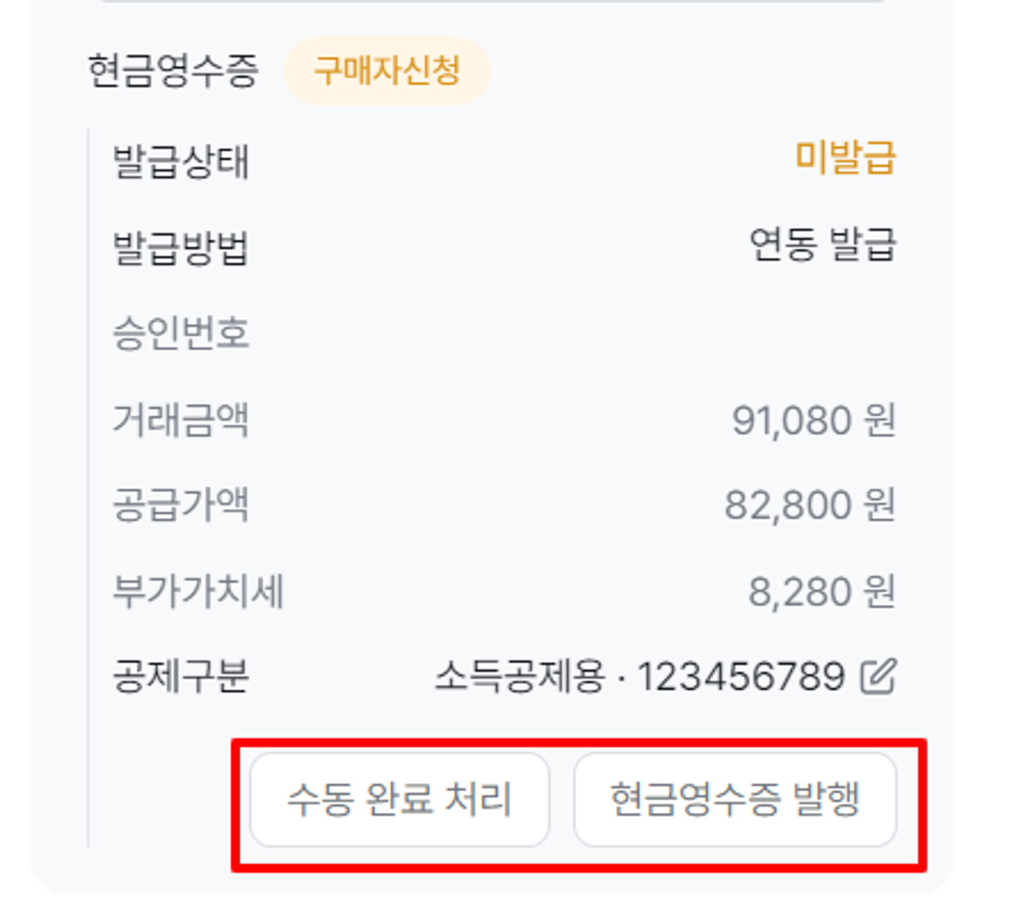 수동 완료 처리 → 수동으로 현금영수증 발행 후 완료처리만 진행
