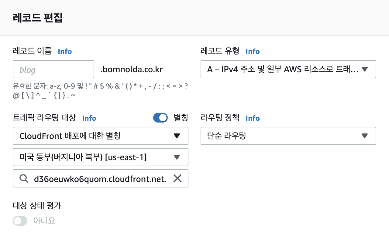 예시: 가비아의 경우, d2hf4l4p4hxmpi.cloudfront.net. 과 같이 주소 끝에 반드시 마침표를 찍어야 정상 등록됩니다.