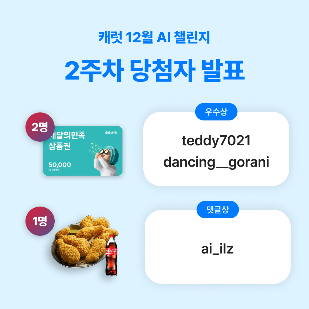 AI 챌린지 이벤트에 많은 관심과 참여 감사드리며, 2주차 당첨자를 안내드립니다.