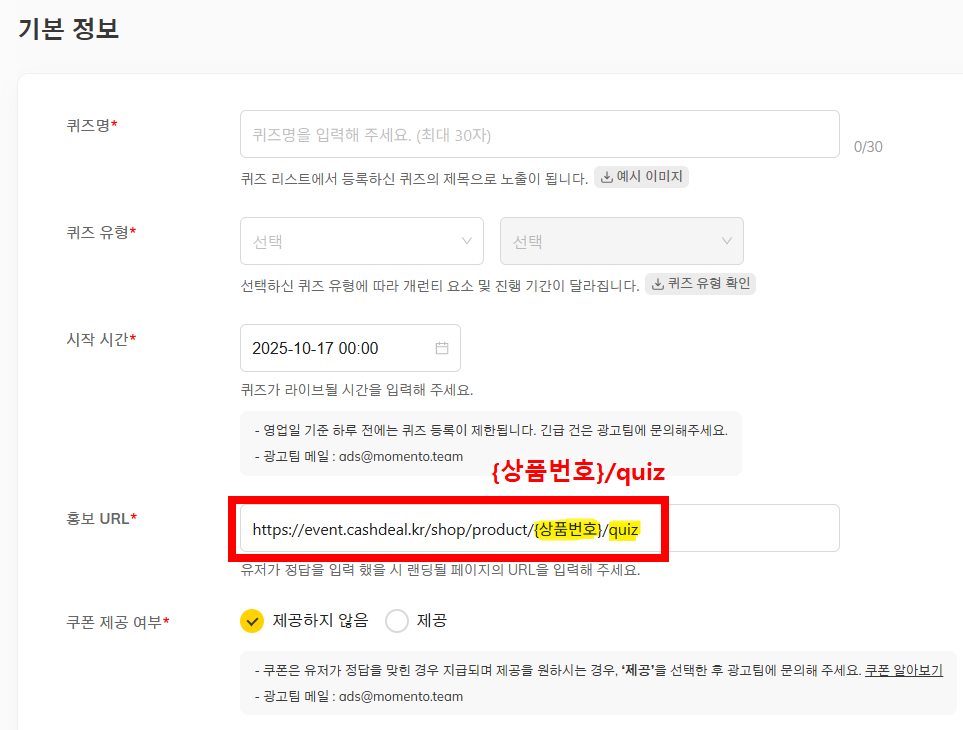 퀴즈 제목, 유형, 시작 시간, 홍보 URL, 쿠폰 여부