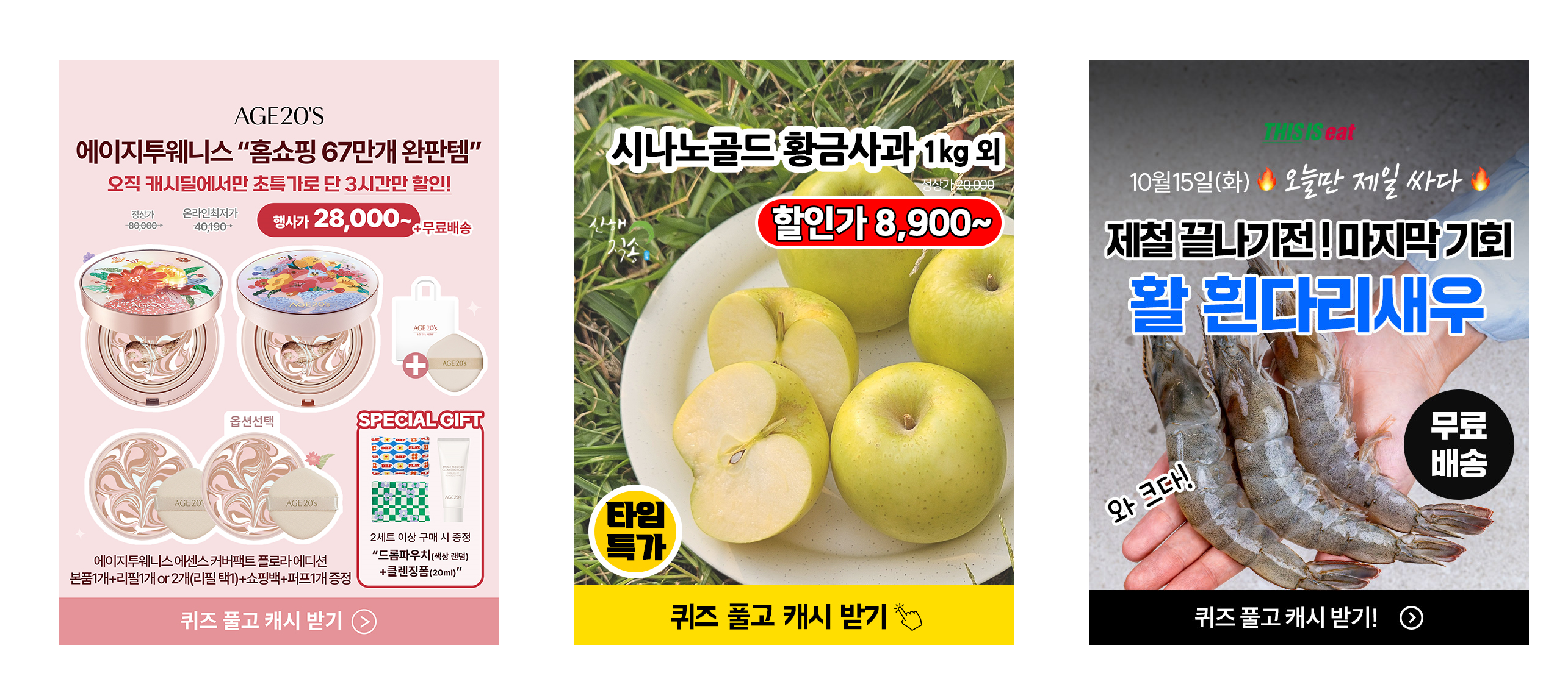 필수 문구 : 타임특가, 퀴즈풀고 캐시받기 (클릭 유도할 수 있게 작업해주세요)